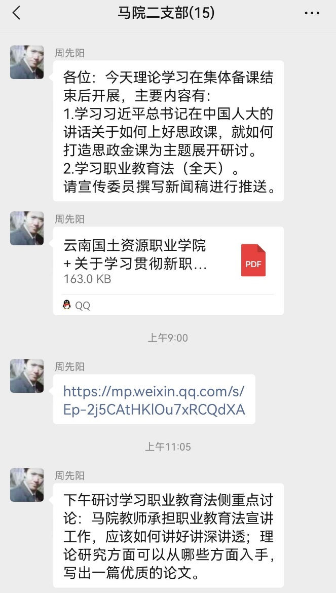 会议第四项议程,学习并讨论职业教育法。会上,支部党员学习了职业教育法,分享了学习心得。会议要求,全体党员要积极参与并认真学习5月8日《学习贯彻新职业教育法宣讲大会》线上公益直播课,在学习过程中留下记录,课程结束后通过拍照的形式将学习记录提交到支部委员处。