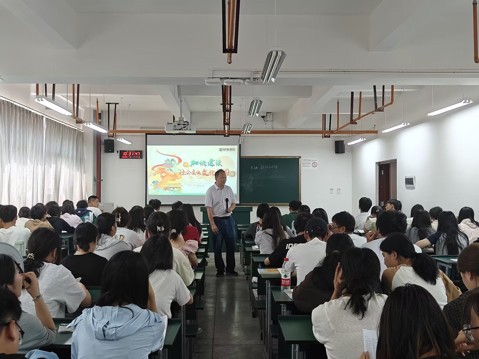 党委委员、纪委书记孙运海以“加快建设社会主义文化强国”为题,为学生梳理了关于文化建设的几次重大会议,从党的十九大到二十届中共中央政治局第17次集中学习会议、从习近平新时代中国特色社会主义思想中的文化思想到2035年建成文化强国战略目标,让同学们深切感受到了国家关于加快建设社会主义文化强国的决心和信心。他结合生活实际围绕“为什么要加快建设文化强国”“我们的底气和信心有哪些”“接下来怎么做”的逻辑思路进行讲解并总结。