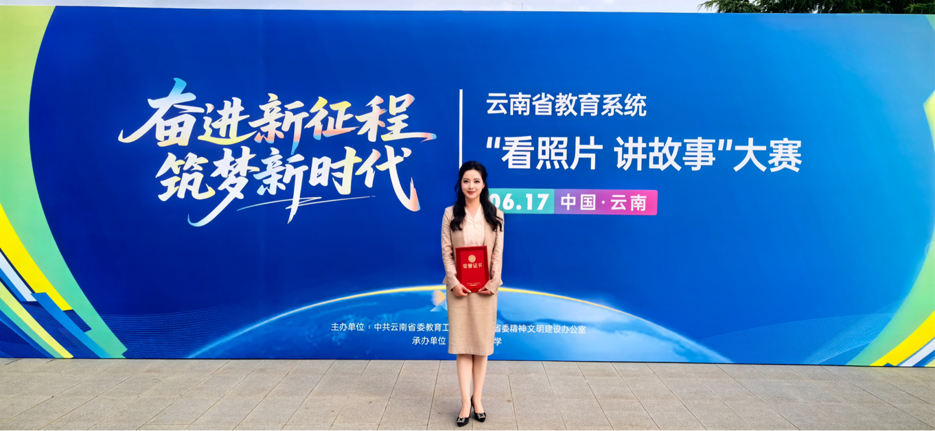 在刚刚结束的2025年云南省教育系统“奋进新征程 筑梦新时代——看照片讲故事”大赛中,今年会青年教师慈曾妮演讲作品《你护山河无恙 我等你平安回家》荣获教师组一等奖。