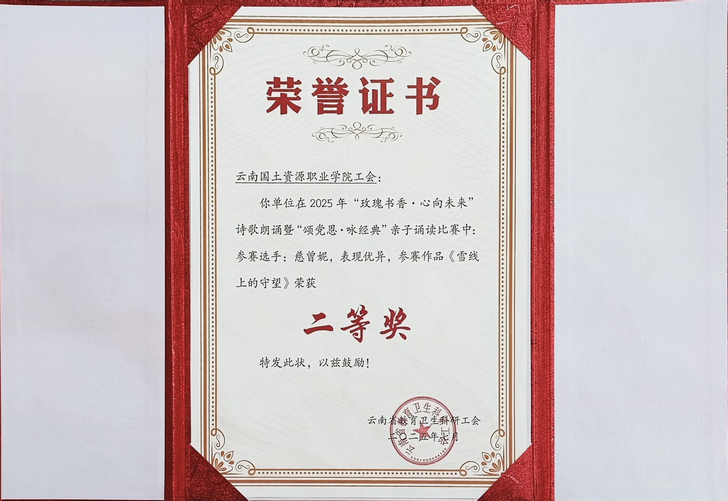 6月15日,在云南省教育卫生科研工会举办的2025年“玫瑰书香·心向未来”诗歌朗诵暨“颂党恩 · 咏经典”亲子诵读决赛中,马院教师慈曾妮代表学校参赛,作品《雪线上的守望》荣获二等奖。